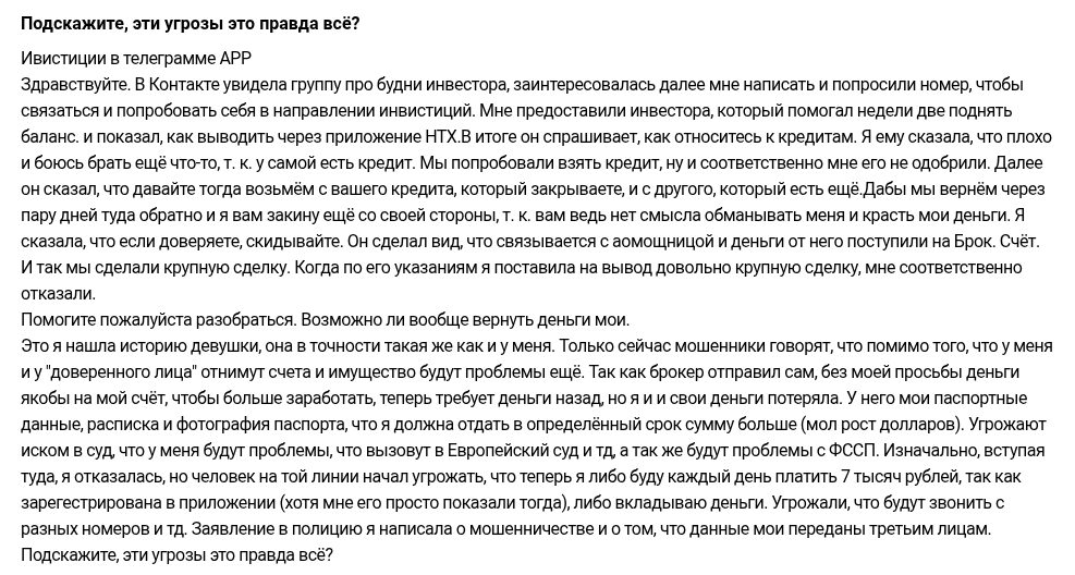 Найти независимые мнения о сотрудничестве с Павлом оказалось довольно легко, ведь тематические площадки уже заполнены гневными рецензиями. Пользователи в деталях рассказывают о том, как их обманывали и вынуждали проводить бесконечные «повторные» платежи. После первого перевода денег вымогательство новых траншей не прекращалось до тех пор, пока у человека полностью не заканчивался фиат или криптовалюта.