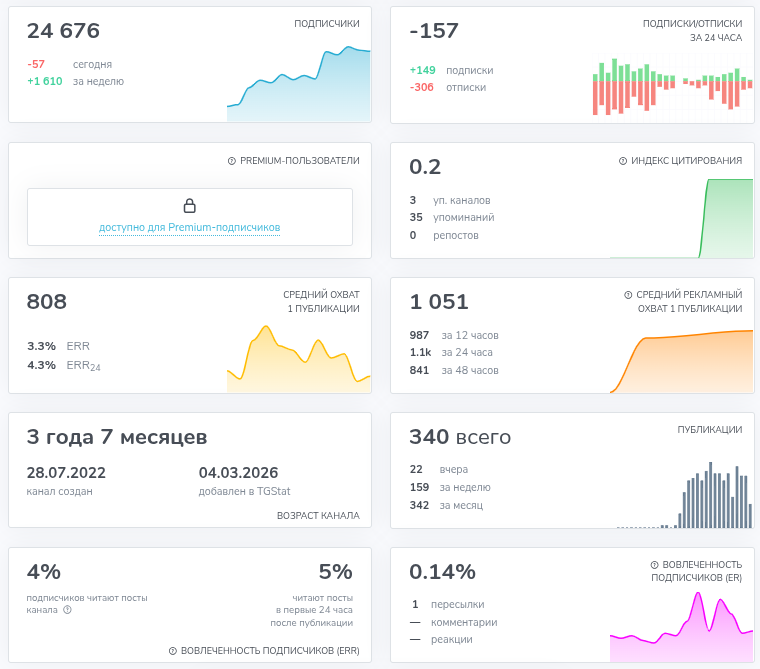 • На момент написания обзора в марте 2026-го счетчик показывает 24 676 подписчиков, однако посты читает всего 4% участников (ER остановился на уровне 0,14%).
