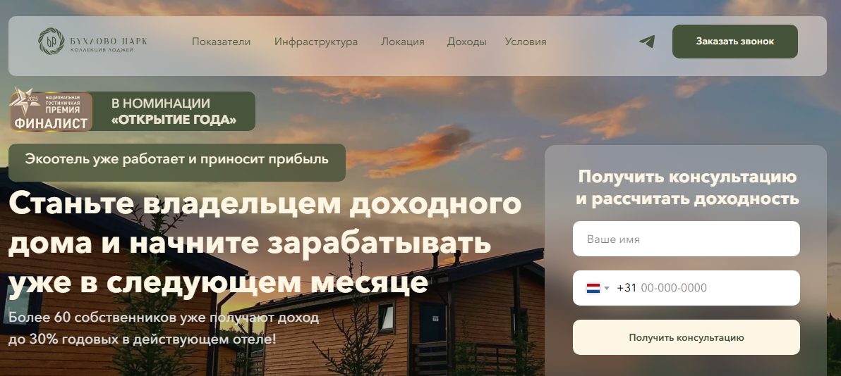 Команда Buhlovo Park предлагает клиентам вкладываться в гостиничную недвижимость. Однако реальный доход клиентов зависит от множества внешних факторов.