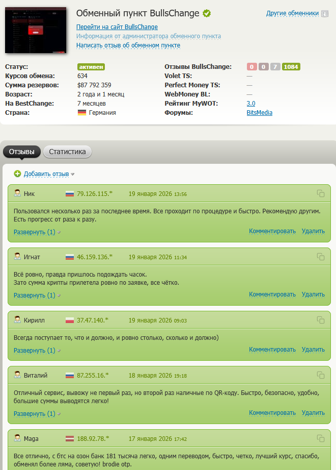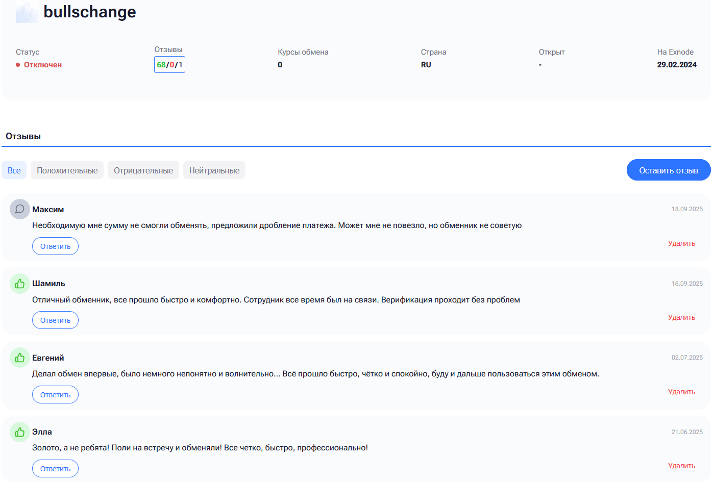 Общая картина отзывов BullsChange Com показывает, что в целом аудитория полностью довольна сервисом. Изредка люди рассказывают о негативном опыте, но процент таких ситуаций слишком мал. А администрация при этом отвечает на комментарии на сторонних площадках официально и обрабатывает негатив клиентов.