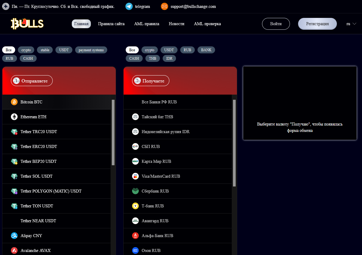 Судя по списку направлений обменника Bulls, сервис преимущественно работает с держателями карт российских банков. Однако еще встречаются предложения по тайским батам и индонезийским рупиям. Что касается самих токенов, на сайте представлены все основные крупные криптовалюты. А если в списке нет подходящего направления, разработчики предлагают написать в поддержку для поиска решения.