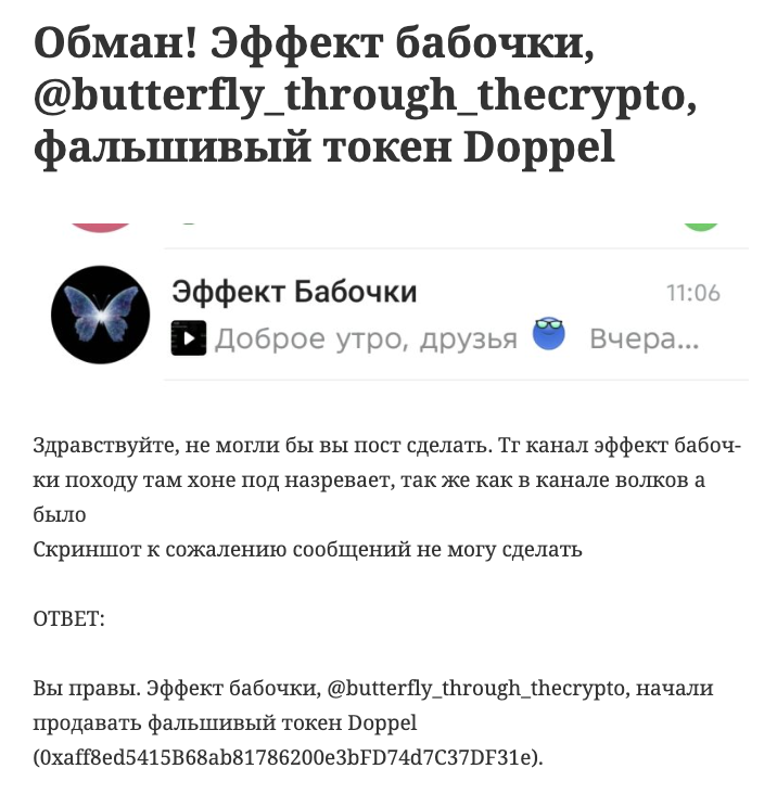 «Эффект бабочки» — канал в Telegram, в котором публиковали обзоры актуальных рыночных ситуаций. После прогрева аудитории его владелец стал призывать аудиторию покупать ханипот-токен Doppel.