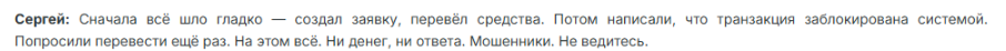 В другом негативном отзыве также подтверждается мошенничество создателей платформы. Комментатор указывает на отсутствие лицензии ЦБ РФ и считает, что площадка создана для обмана пользователей, которые желают по-быстрому и по выгодному курсу перевести валюту.