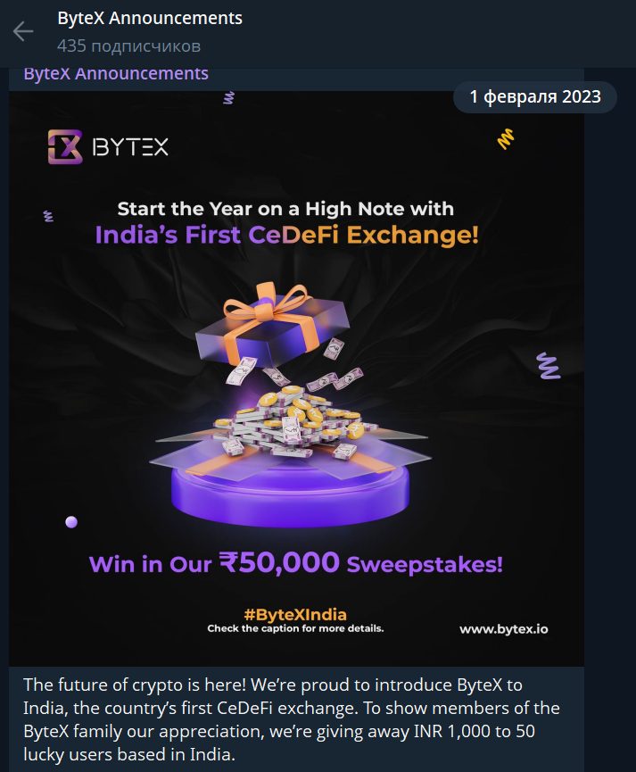 Меньше всего подписчиков у проекта на каналах в Телеграм и Ютуб с ником ByteXExchange – примерно по 450, причем они даже не добавлены на аналитические сервисы, поэтому изучить их можно только вручную. В мессенджере посты набирали в среднем по 2000 просмотров, но последний выложен в феврале 2023 года, а на видеохостинге вообще роликов нет.
