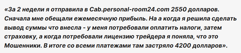 Мы не рекомендуем брокера, поскольку с высокой вероятностью это развод и клиенты могут потерять деньги с Personal Room24.