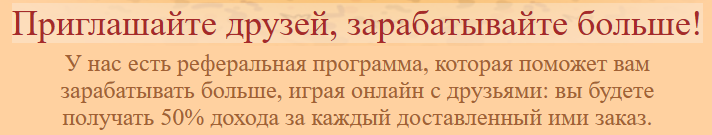 Разработчики сайта мотивируют геймеров активно приглашать в проект своих друзей, получая процент от заработанных ими игровых денег. В отличие от многих других рефералок, которые приносят реальный доход, здесь в виде вознаграждения предлагают фактически «воздух», а именно — внутриигровые коины.