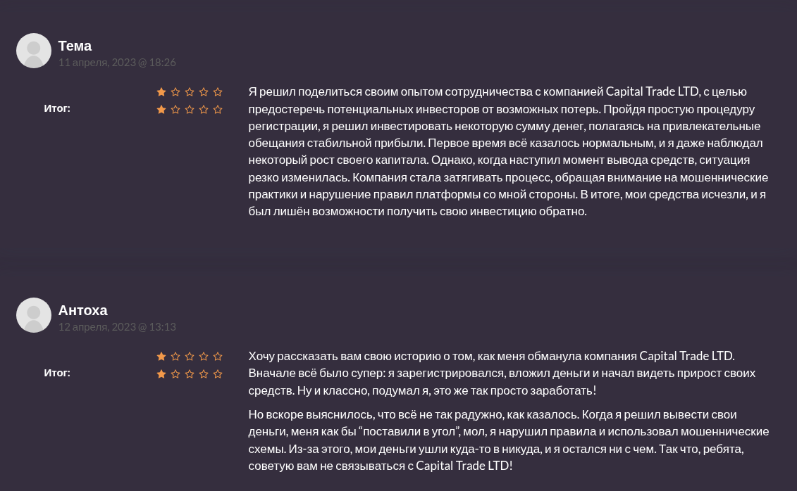 Capital Trade Limited — проект без верифицированной финансовой истории, без лицензий и без прозрачной работы. Реальных фактов выплат нет, зато есть массовые случаи невозврата средств. Вносить деньги на эту платформу рискованно.