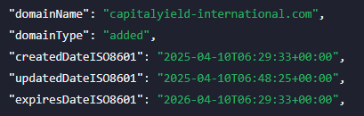 Домен capitalyield international com создан только в апреле 2025 года, и заявленная история работы с 2017 года ничем не подкреплена.