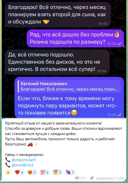 Основатели телеграм-сообщества «Кар Хаб Авто» выкладывают в группе фидбек пользователей, решивших оформить покупку авто именно на этой платформе через менеджера Avtobro53.