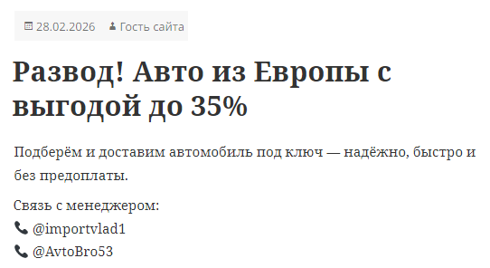 Организатор автомагазина пользователь с никнеймом в ТГ Avtobro53 предлагает оформить покупку машины онлайн, но отзывы об этом продавце в сети зафиксированы далеко не положительные. Люди утверждают, что салон принадлежит мошенникам. Поэтому мы решили проанализировать Telegram-проект и выяснить, заслуживает ли он доверия в действительности.