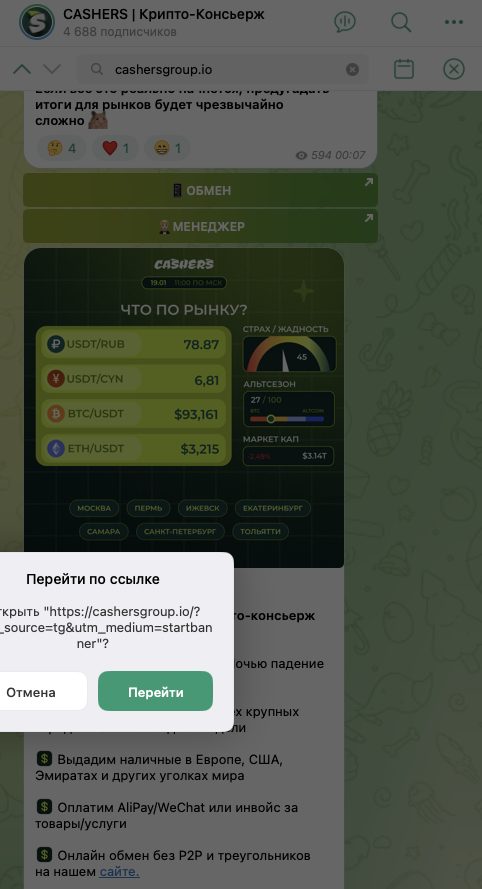 На 30 января 2026-го года на телеграмм-канал обменника CashersGroup подписаны 4,7 тысяч пользователей. Публикации в его ленте собирают по 500-600 показов и 10-15 реакций.