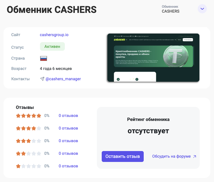Согласно неподтвержденным данным, эксчейнджер функционирует более четырех лет. Тем не менее, сайт cashersgroup io появился только в начале 2025-го, а официальный ТГК зарегистрирован в июле 2024-го года.