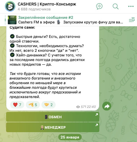 У владельцев обменника существует телеграмм-канал. Он называется «Cashers Крипто Консьерж», а располагается по адресу Cashers Io. Он был создан 11 июля 2024-го года. Тогда же в его ленте появился первый пост.