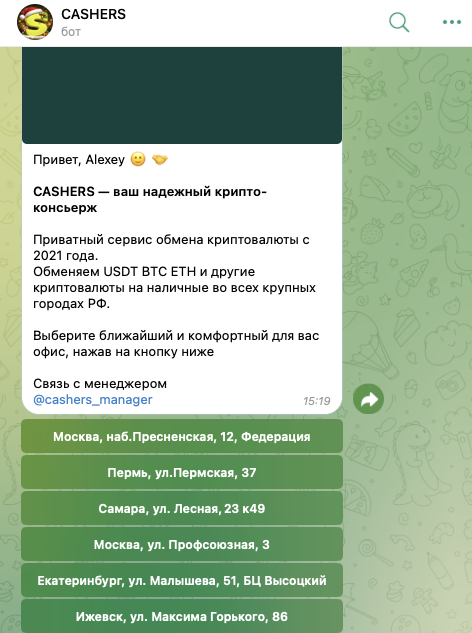 Через бота можно выбрать в том числе обмен крипты на наличные. Сразу после активации сервиса в его чат приходит список адресов офисов компании.