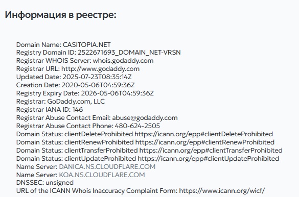 Домен casitopia.net зарегистрирован 6 мая 2020 года. Казалось бы, проекту уже почти шесть лет, что внушает доверие. Но тут важно вспомнить, что сам брокер в рекламных материалах заявляет о работе с 2017 года. Получается нестыковочка целых три года. Компания говорит, что работает на рынке с 2017-го, а домен появился только в 2020-м.