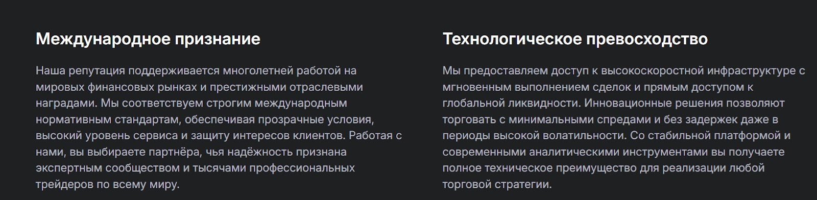 Еще брокер активно продвигает идею технологического превосходства. Клиентам обещают доступ к высокоскоростной инфраструктуре и мгновенное выполнение сделок. Рассказывают о минимальных спредах, отсутствии задержек даже при сильных скачках рынка и современных аналитических инструментах. Создают образ идеальной площадки для профессиональной торговли.