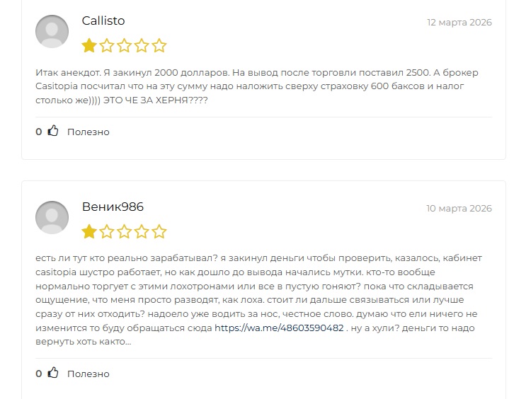 Пользователь с ником Callisto оставил эмоциональный отзыв 12 марта 2026 года. Он закинул на счет 2000 долларов, успешно поторговал и решил вывести 2500. И тут началось. Брокер Casitopia посчитал, что сверху нужно заплатить страховку 600 долларов и налог еще столько же. Сделка была прибыльной, но вместо денег ему предлагают доплатить. История типичная для мошенников: когда клиент хочет забрать реальные деньги, начинают выдумывать дополнительные платежи.
