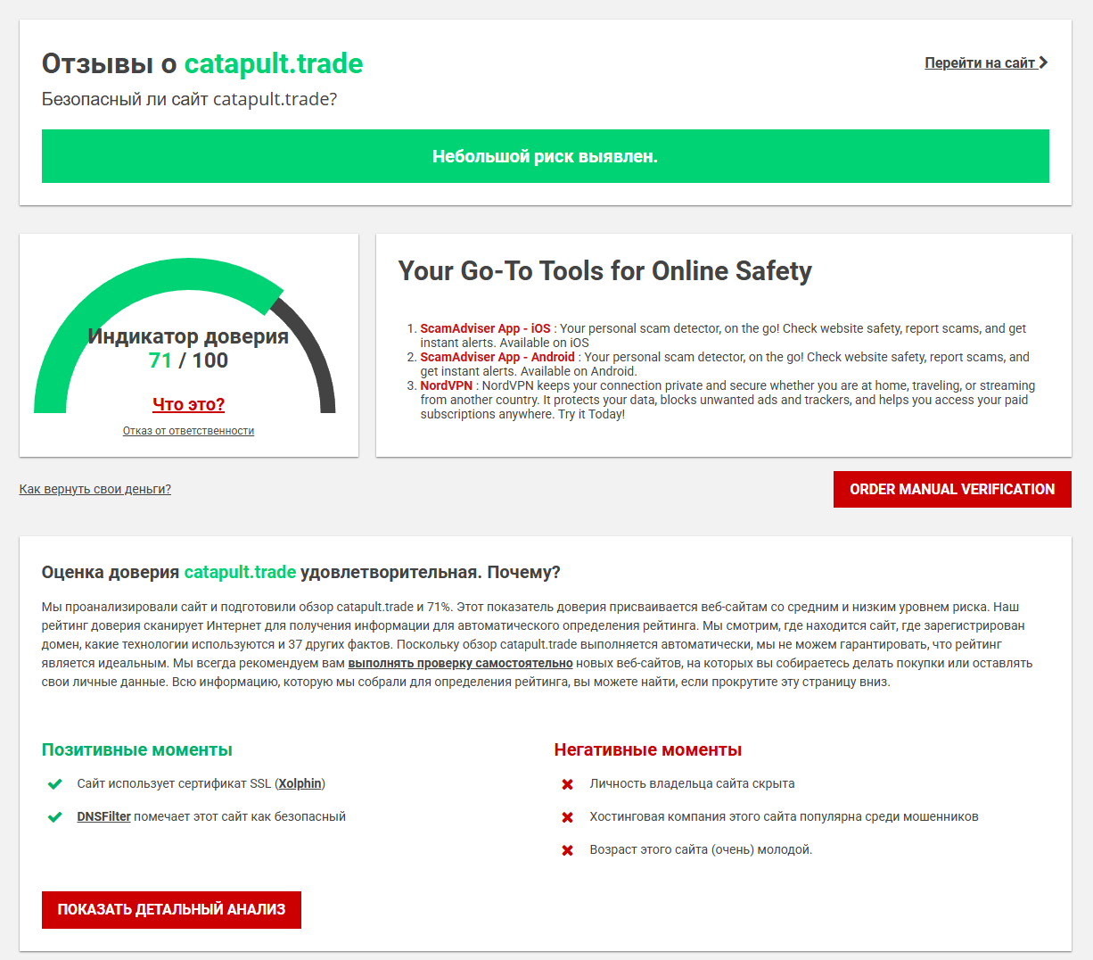 Есть лишь некоторые сообщения от трейдеров, которые интересуются проектом, но никакой конкретики не предоставлено. Заметим, что сервисы для проверки сайтов присвоили домену средний балл за счет молодого возраста и скрытого владельца. При этом никаких прямых обвинений в мошенничестве, а также отзывов о том, что https Catapult trade — это лохотрон в сети пока не обнаружено.