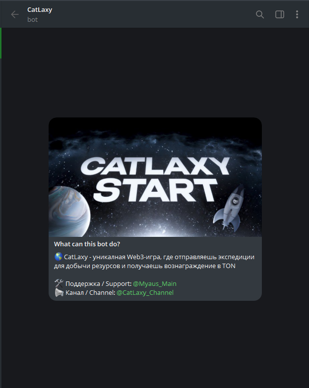 КэтЛакси позиционируется разработчиками как уникальная Web3-игра с виртуальными экспедициями, где добываются реальные TON. Запускается мини-приложение традиционно через бота. И стоит сразу отметить, что его статистику админ скрыл, а в описании есть текстовые ошибки.