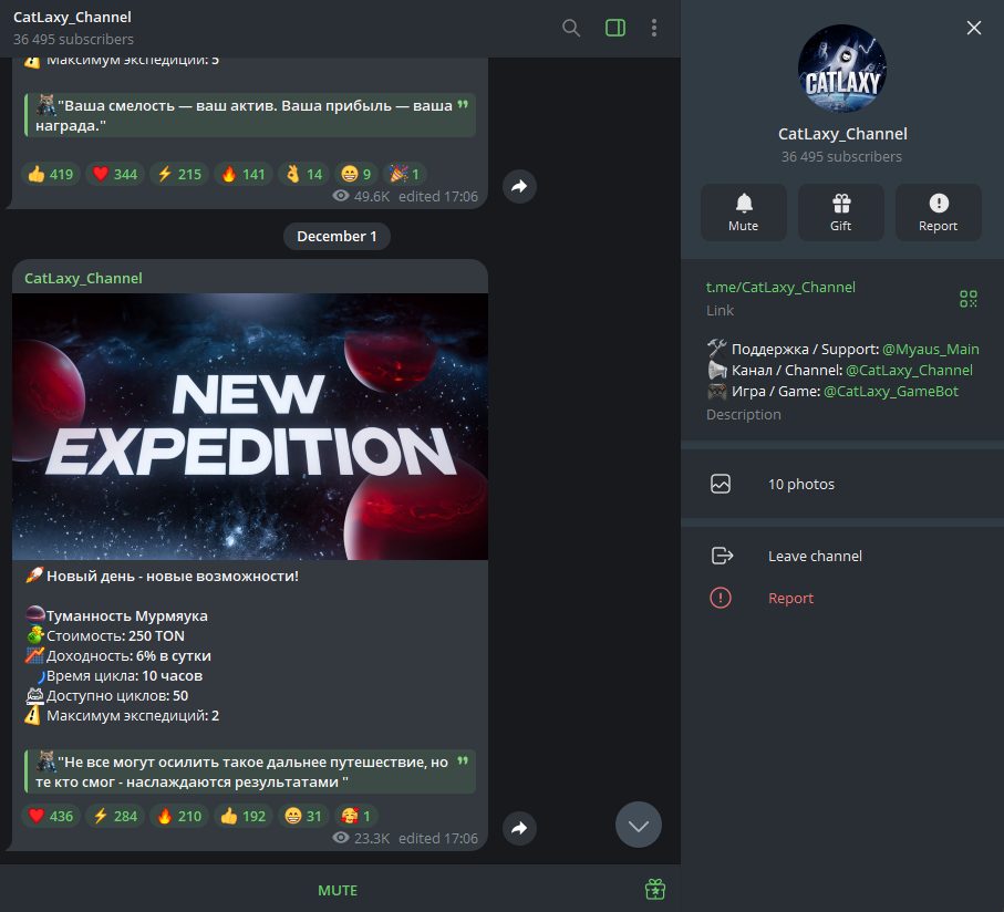 Как такового геймплея онлайн-игра не предлагает, это скорее геймификация денежных вложений. Разработчики добавляют различные виртуальные экспедиции с разной стоимостью и условиями. Все они также дублируются в официальном ТГ-канале на 36.5 тысячи подписчиков, где закрыты комментарии.