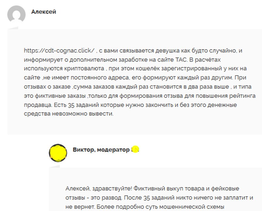 В одном из отзывов о компании https Cdt Cognac Click Tac раскрывается схема поиска потенциальных сотрудников и дальнейшей работы. По словам пользователя сначала с ним связалась девушка, которая предложила легкий заработок. Вариантов дохода два – обратный выкуп товаров и формирование отзывов о продукции на сайте. Для расчетов используется только крипта.