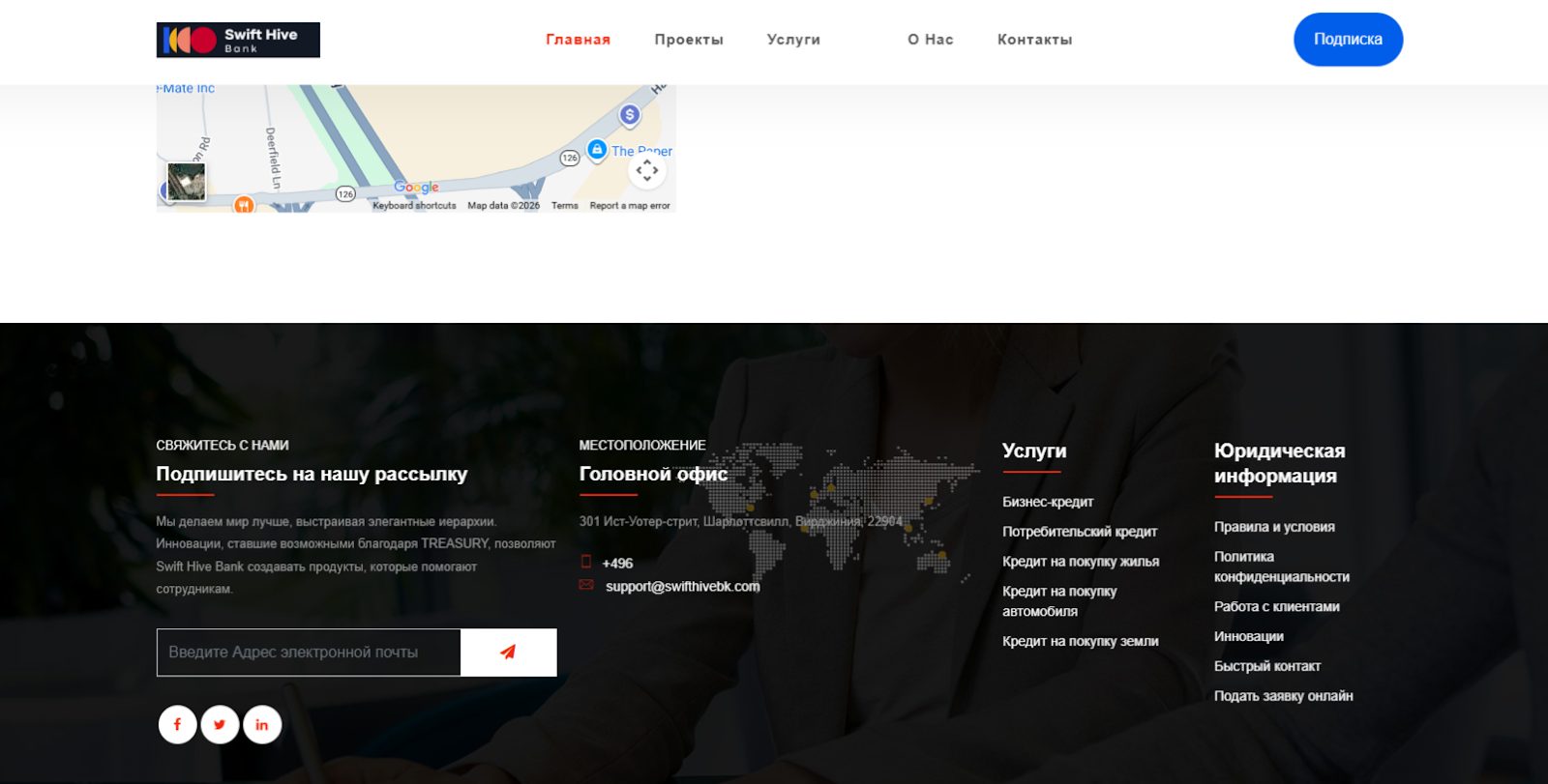 Дизайн портала наделен простотой, функциональностью и сдержанной цветовой палитрой. На главной странице посетителей встречают разделы «О нас», «Бизнес-банкинг», «Личный банкинг», «Кредитные карты», «Кредиты» и т. д. Вкладка «О нас» повествует о компании, которая работает в банковской сфере 10+ лет, имеет 18+ млн. довольных клиентов. Адрес организации: 301 Ист-Уотер-стрит, Шарлоттсвилл, Вирджиния 22904. Ссылки на лицензию у банка отсутствуют.