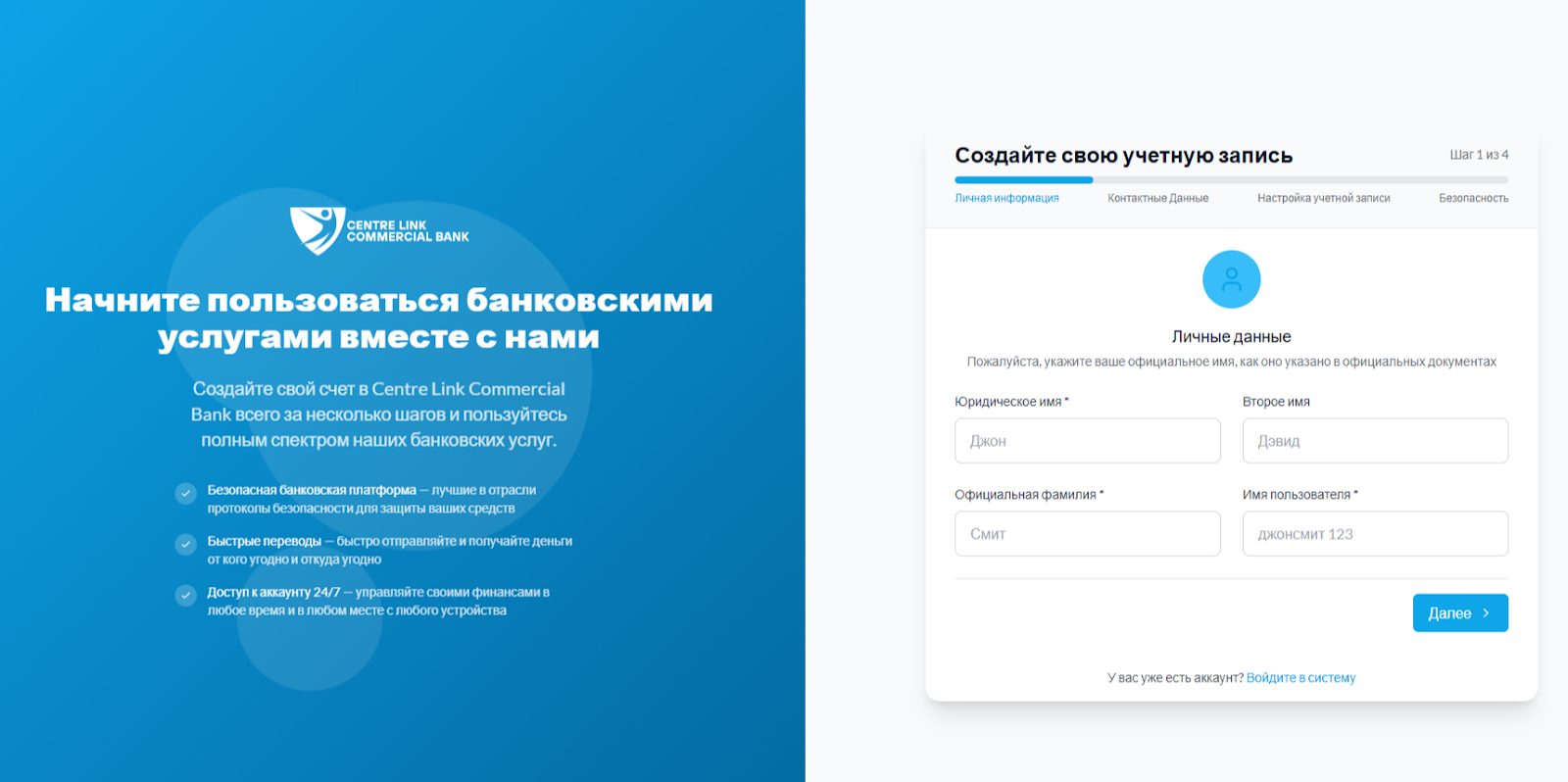 Воспользоваться услугами платежной системы Centre Link Commercial Bank могут все желающие от 18 лет. Для этих целей необходимо создать учетную запись на веб-сайте банка. Процедура предусматривает заполнение анкеты: юридическое имя, отчество, фамилия, имя пользователя и т. д. После верификации клиент получает доступ к глобальным переводам и другим опциям.