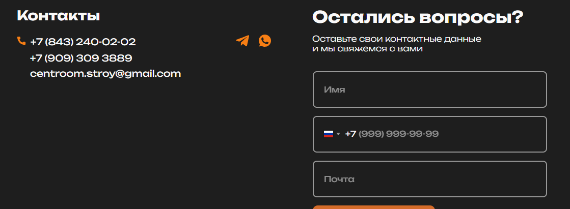 Задать вопрос менеджерам можно через форму на сайте, написав письмо на почту sale@centroomstroy ru или позвонить по телефону +7 (843) 233-52-36.