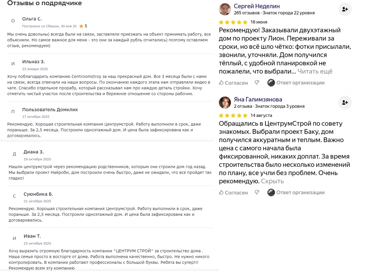 На своем сайте владельцы Центрум Строй разместили блок отзывов о строительстве домов, а также ссылки на свою страницу на Яндекс Картах. Все комментарии с благодарностями, клиенты отмечают высокое качество выполнения работ и профессионализм сотрудников.
