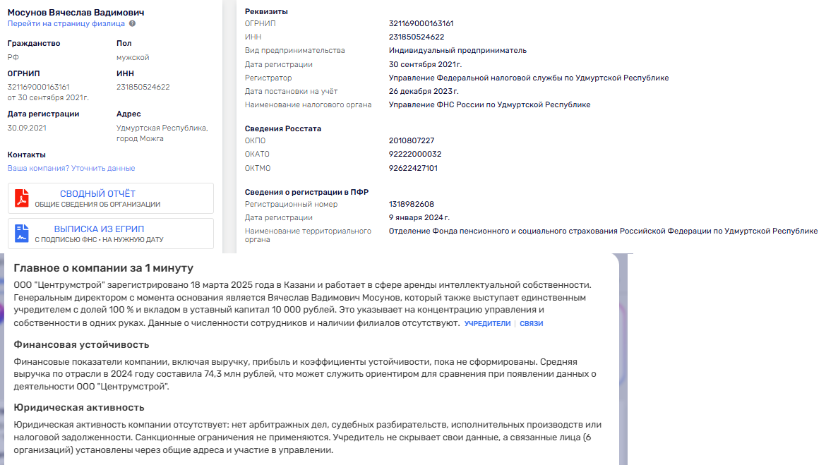 - ООО Центрустрой, Вячеслав зарегистрировал только 18 мая 2025 года. Уставной капитал — минималка 10К руб. Для строительной компании с заявленными масштабами это ничтожно мало. Вся работа базируется на инвестиционном капитале.