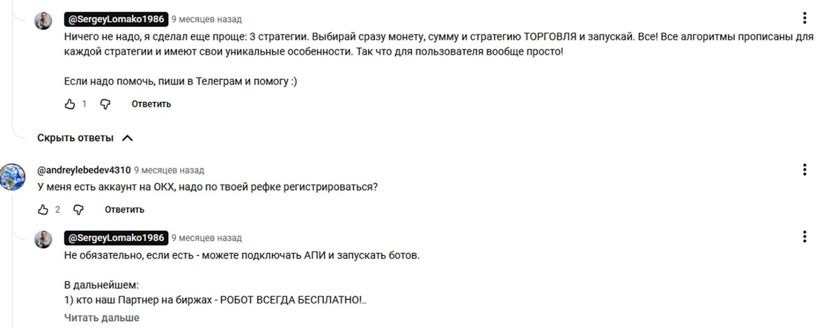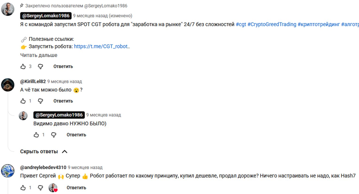 Отзывы также можно найти на канале Ютуб, где Сергей регулярно выкладывает информационные и отчетные видео о работе с приложением. Обвинений в мошенничестве также не найдено, пользователи просто задают вопросы, касающиеся функций бота, особенностей запуска.