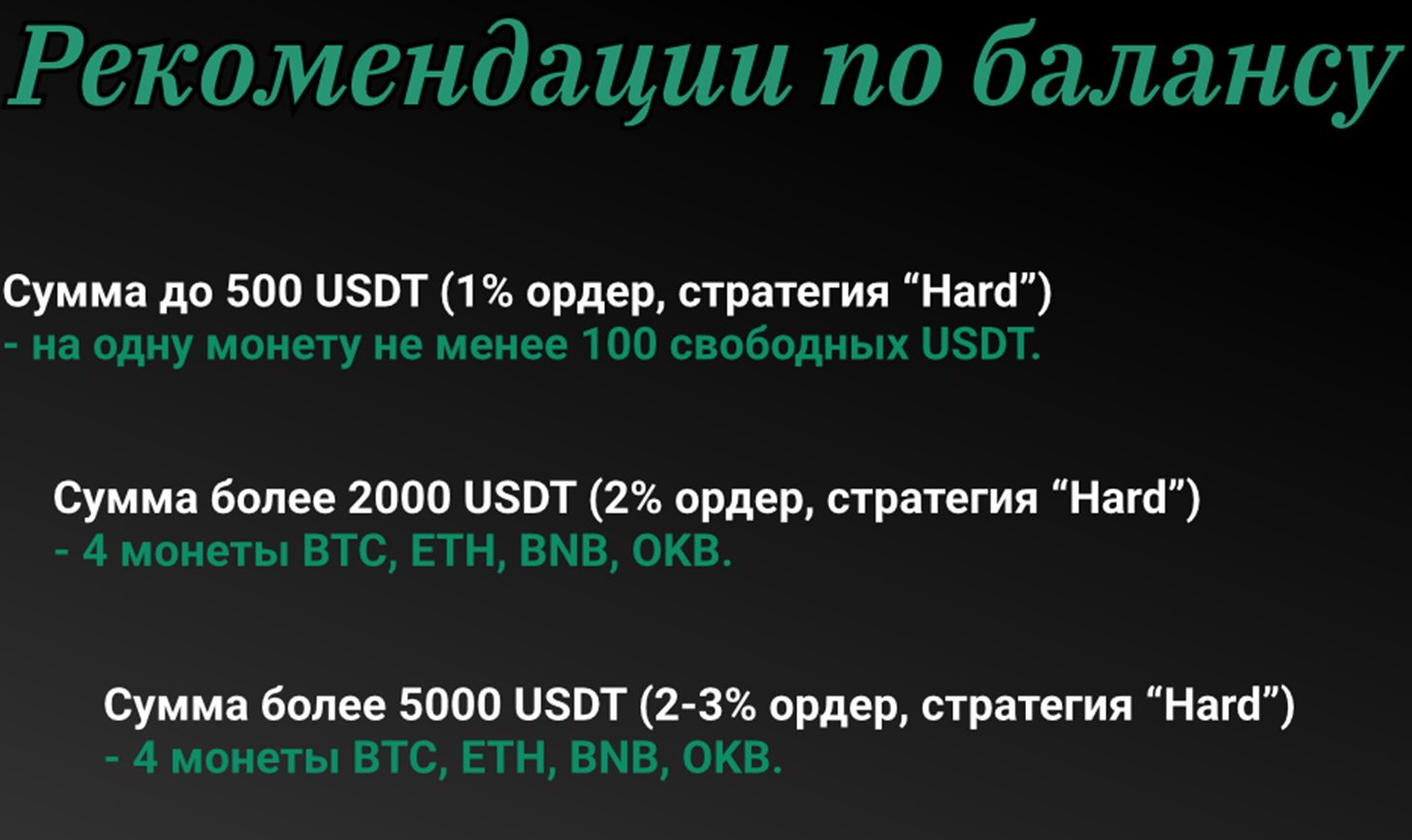 На каждую монету лучше ставить от 100 USDT, если общая сумма вклада не превышает 500. Если сумма счета более 2 тысяч, можно ставить на 4 монеты и 2% на ордер. Все инструкции есть в описаниях бота, если пользователю требуется консультация, разработчик всегда готов помочь. После завершения настроек можно начинать торговлю в авторежиме.