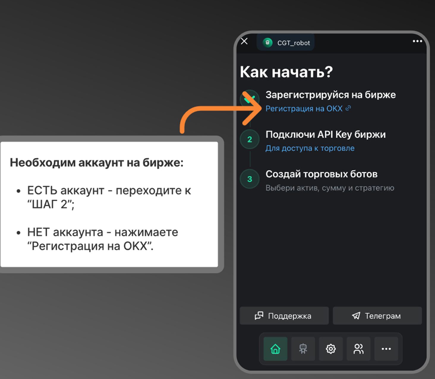 Разработчик дает подробную инструкцию по работе со скриптом. Найти ее можно в группе VK и на канале ТГ. Перед тем, как начать торговлю, нужно перейти на страницу бота. Одновременно с этим требуется зарегистрироваться на бирже OKX или BingX. Если аккаунты уже есть, открывать их заново не нужно.