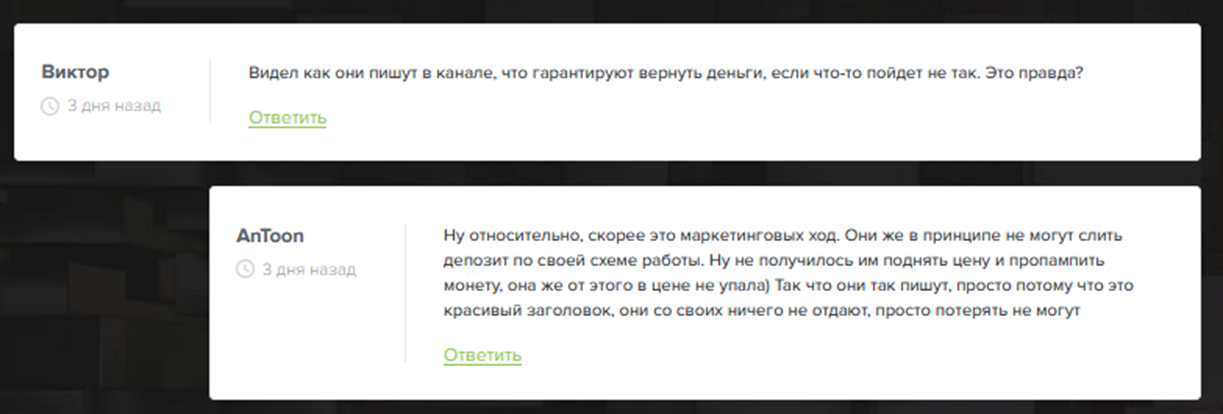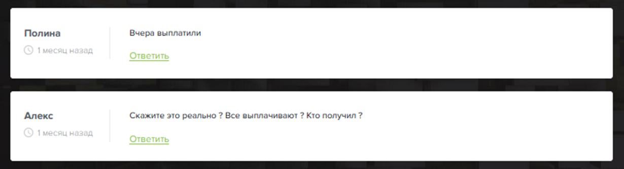 Опубликованные отзывы положительные, жалобы и обвинения в скаме не найдены. Некоторые пользователи сомневаются в возможности получения дохода. Но и доказательств, что администрация обманывает своих клиентов, нет.