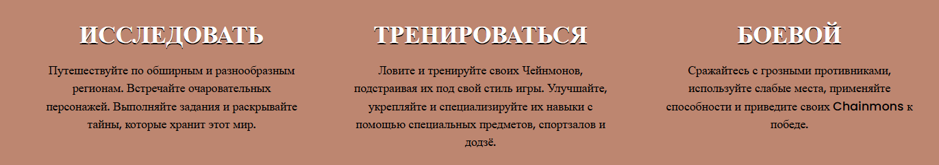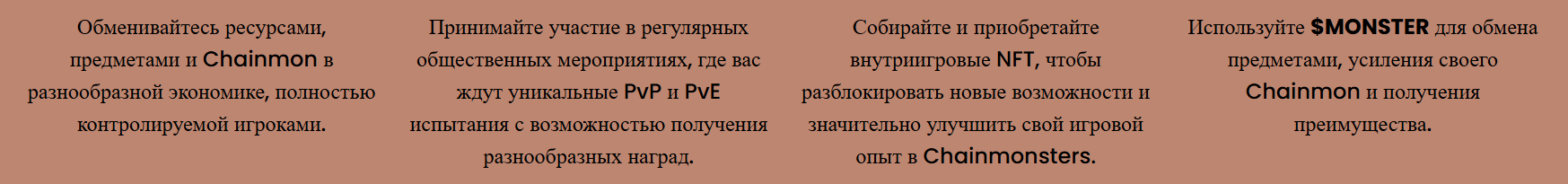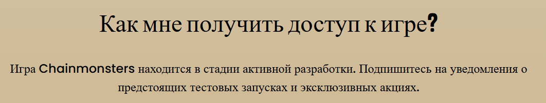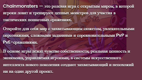 Разработчики сайта Chainmonsters Com предлагают геймеру «путешествовать по большому миру», «встречать персонажей», «ловить и тренировать монстров». Однако по состоянию на апрель 2026 года все эти возможности недоступны. Зайдя на лендинг проекта, игрок не может там зарегистрироваться или скачать приложение. Таким образом, пока что сервис находится на стадии «планирования».