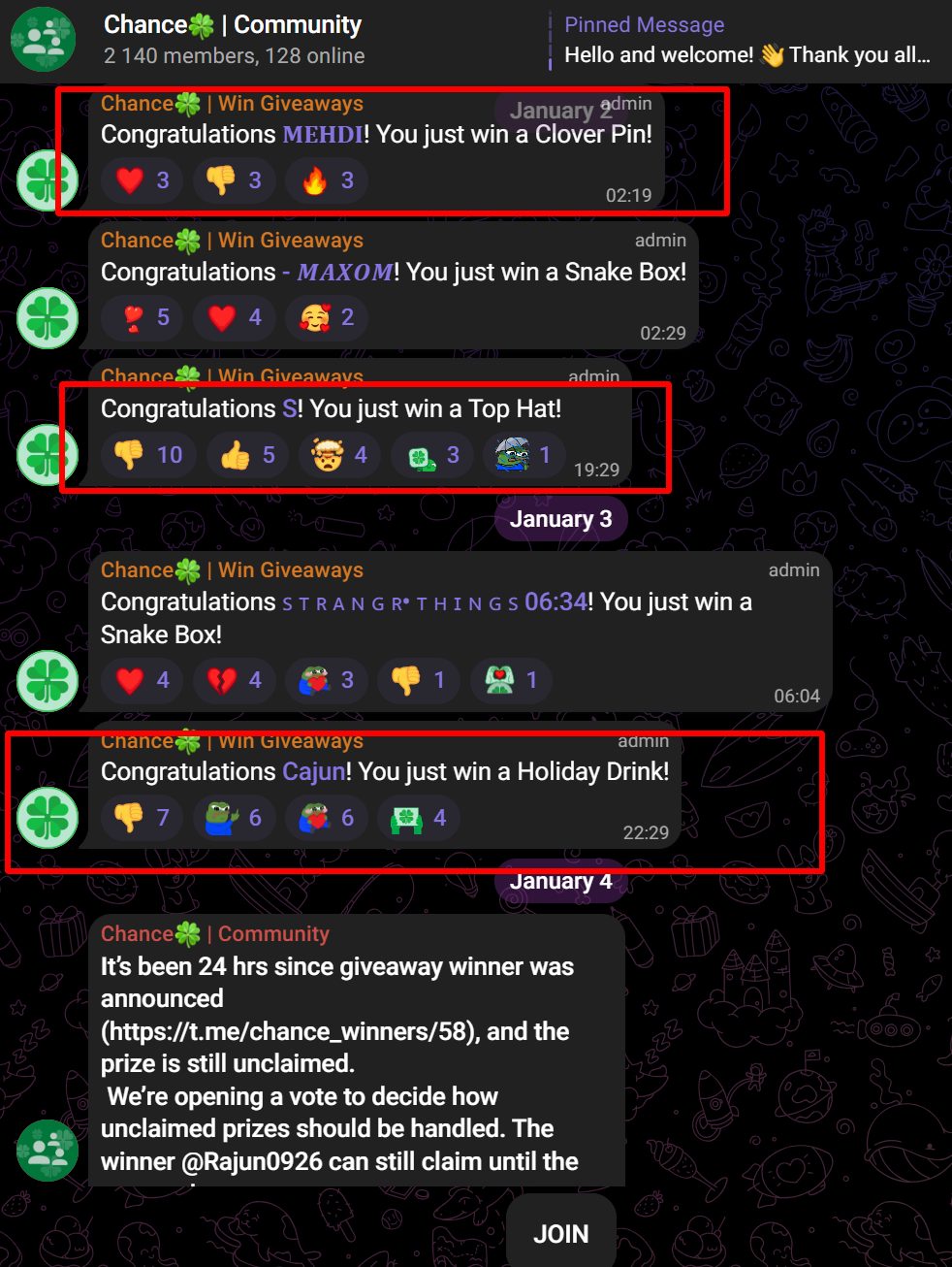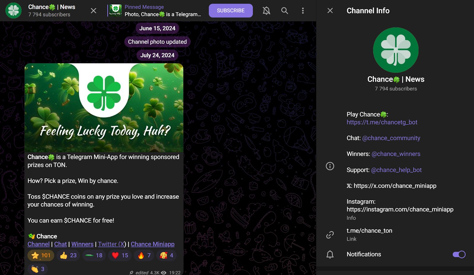 • Чат Chance community — чуть больше 2100 подписчиков, сообщения могут писать только администраторы, раз в неделю публикуют список победителей.