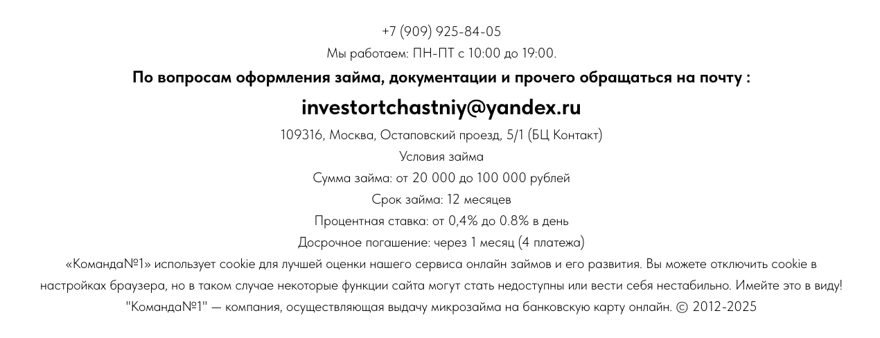 «Частный инвестор Команда 1» — сервис, владельцы которого предлагают займы от 20 до 100 тысяч рублей под 0,4-0,8% в день. Заявлено, что максимальный срок возврата средств составляет 12 месяцев.