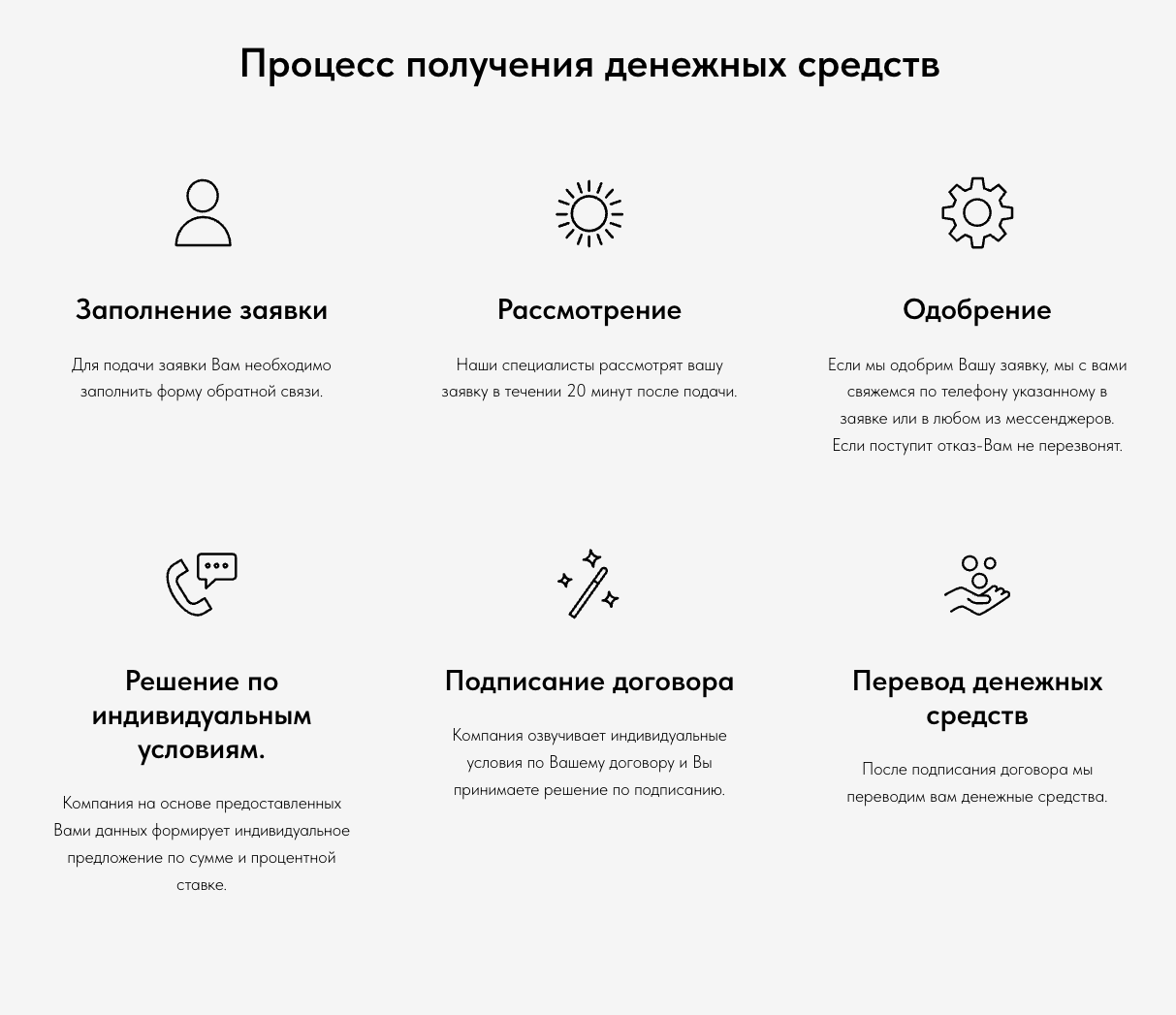 Представители компании заявляют, что оформить заем через них очень легко. Для этого требуется представить только паспорт. Заявки на кредиты рассматривают в течение 20-ти минут.