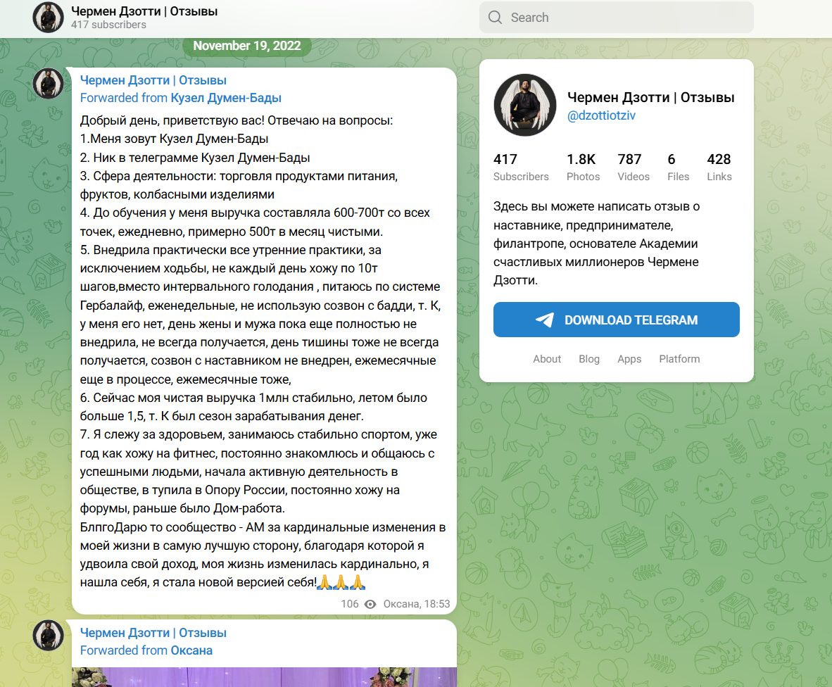 У эксперта можно найти отзывы об обучении в специальном канале «Чермен Дзотти отзывы» в тг. Большинство из них положительные: люди пишут, что переоценили ценности или вышли на новый уровень дохода. Но прямых доказательств этому нет.