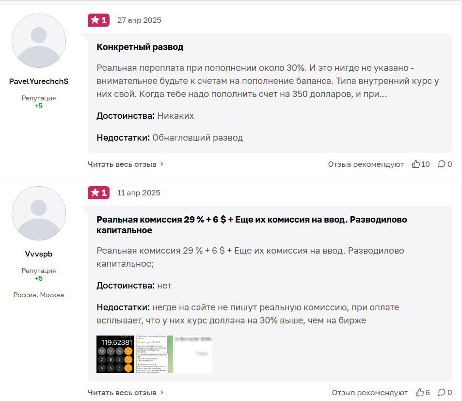 Возмущенные пользователи утверждают, что реальные сборы составляют 30%, причем об этом нигде не написано, причем владельцы сами устанавливают курс доллара, который может сильно отличаться от настоящего.