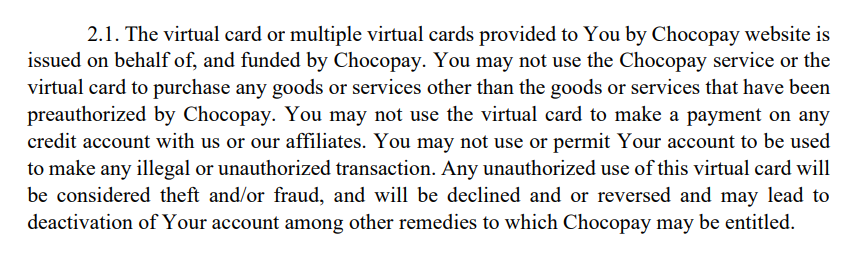 Оформить карту «ЧокоПай» предлагают в боте Телеграмм, но в документе «Пользовательское соглашение» много подозрительных пунктов, например, доступна только оплата товаров и услуг, предварительно авторизованных сервисом. Другими словами, это не обычные виртуальные карты, а узкоспециализированный инструмент для конкретных целей, определенных оператором.