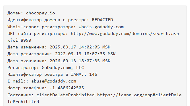 Профилей в других соцсетях не представлено, зато можно проанализировать сайт Web ChocoPay io, который, по информации с Whois ru, создали 13.09.2022.
