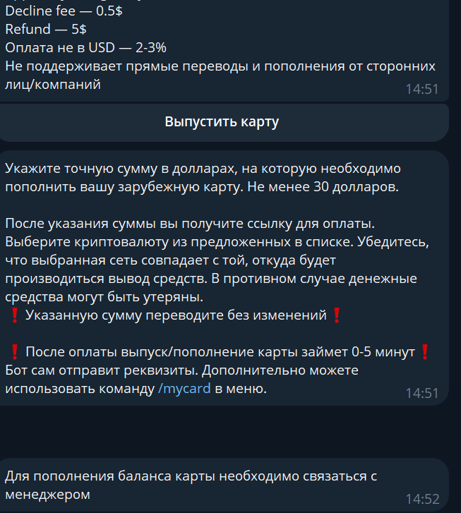 - Пополнение карт и все взаимодействие происходит только через менеджера в мессенджере, что исключает автоматизацию и прозрачность финансовых операций.