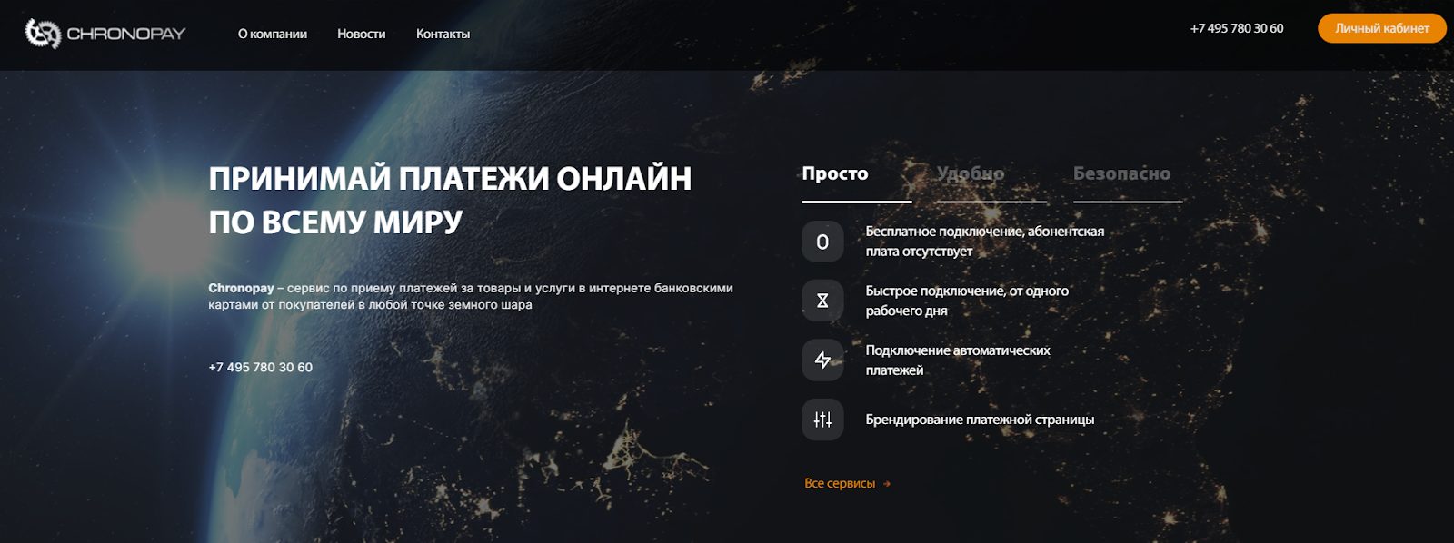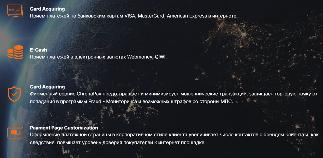«ХроноПэй» обрабатывал платежи в интернете. Клиенты принимали деньги по картам со всего мира. Работали VISA, MasterCard, МИР, Maestro, UnionPay, JCB International, Diners Club. Плюс электронные кошельки WebMoney и QIWI.
