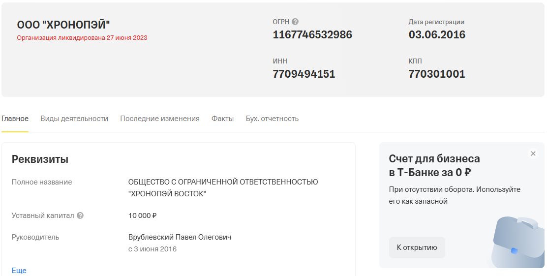 Компанию ООО «Хронопэй Восток» создали 3 июня 2016 года. Директор – Павел Врублевский. Учредитель Дмитрий Артимович с 1%. За 2021 год выручка 32,7 млн рублей. Убыток 5 млн рублей. Падение оборотов вдвое за год. Ликвидация компании случилась 27 июня 2023 года.