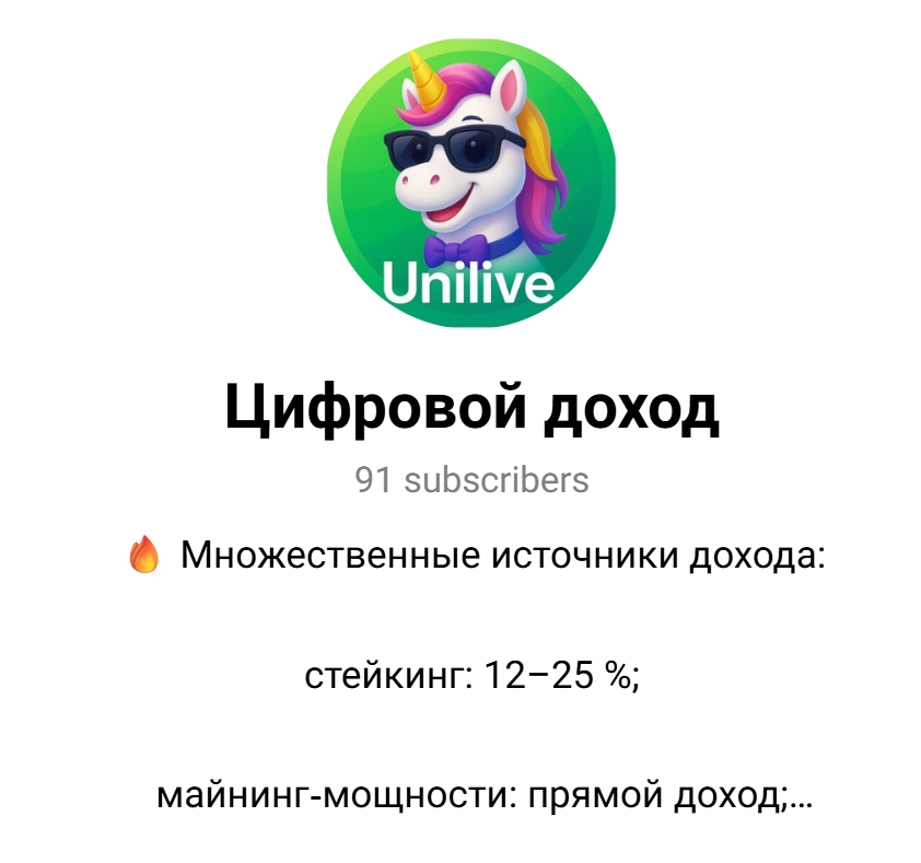 Проект Цифровой доход в Телеграмме и работает по ссылке @UNIIMEX. Сообщество запущено только 1 сентября 2024-го, но первая публикация появилась только 3 декабря 2025-го. Клиентам предлагают следующие варианты заработка с Унилайв: