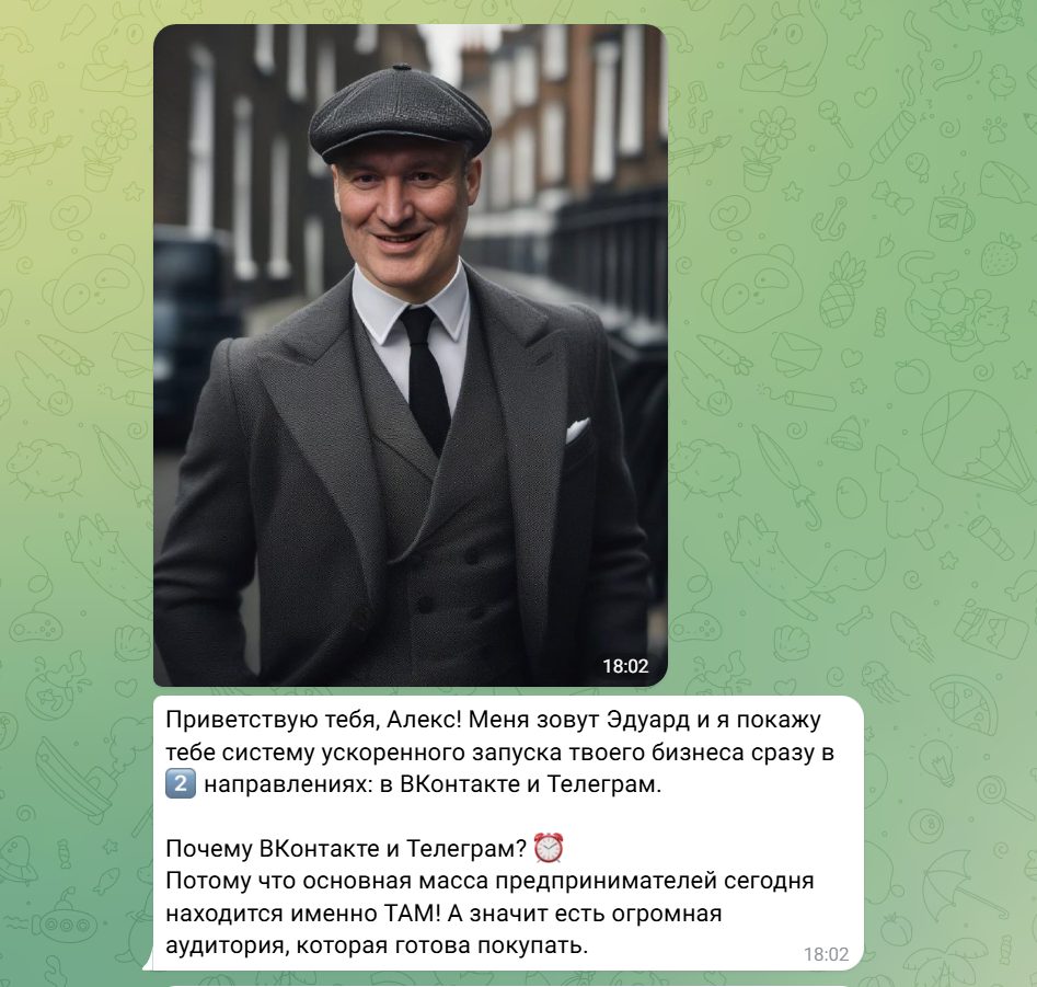 В своем официальном аккаунте автор продвигает проект Мастер по ссылке MasterVK_bot. После запуска появляется приветствие со стороны автора. Он называет себя Эдуардом и рассказывает о возможности заработка на собственном бизнесе в Телеграмме или в ВК.