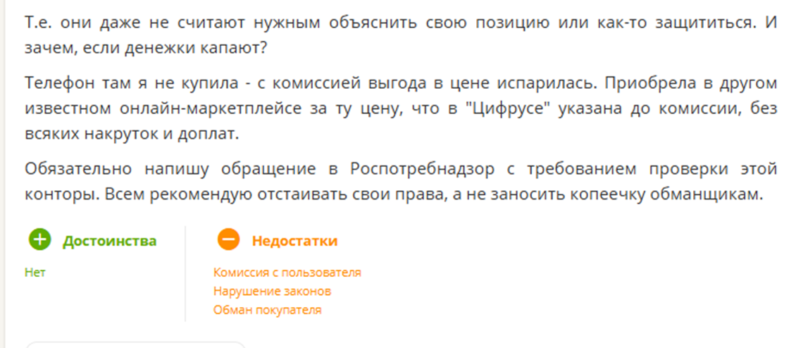 Но есть недовольные ценообразованием на сайте «Цифрус». Оказывается, при оплате товара нужно оплатить комиссию, Она может достигать 10% от суммы.
