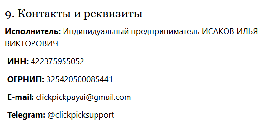 Юридическая информация раскрывается частично. В оферте указан правообладатель – предприниматель Илья Викторович Исаков, его ИНН, ОГРНИП и контактный e-mail. При этом технические вопросы обсуждаются в Телеграм-канале @clickpicksupport. Это снижает риск анонимности, однако не освещает техническую инфраструктуру, серверы хранения или внешние подрядчики, участвующие в обучении моделей.