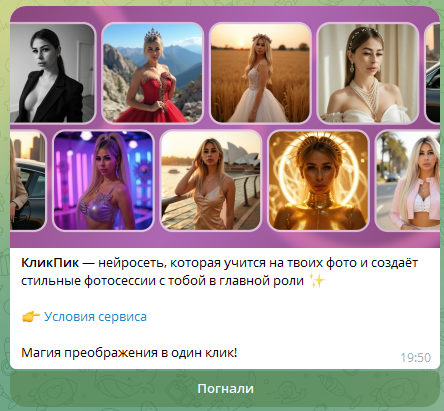 Проект объединяет два Телеграм-канала: КликПик ИИ — нейрофотосессия, фотосессия ИИ, Клик Пик и КликПик Образы и Стили. Основная услуга сервиса – создание стилизованных изображений по загруженным фотографиям. Пользователь отправляет селфи боту, выбирает стиль или промпт, после чего получает готовые изображения.
